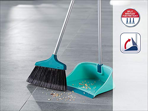 Het stoffer en blik met lange steel en open blik van Leifheit is ideaal voor het vegen zonder te bukken. De bezem veegt bijzonder grondig dankzij de fijne borstelharen en de vorm die is aangepast aan de veeghoek. Hiertoe dient ook de asymmetrische vorm van de bezem. Deze is aan de veeghouding aangepast, zodat alle borstels ook bij een schuin gehouden steel volledig op de ondergrond liggen. Een ander voordeel is het blik met de extra lange rubberen lip, die het opvegen op oneffen ondergronden vereenvoudigd. Voor het ruimtebesparend opbergen wordt de bezem aan de bliksteel bevestigd en wordt het blik ingeklapt. Met schraapkant voor het reinigen van de bezem.