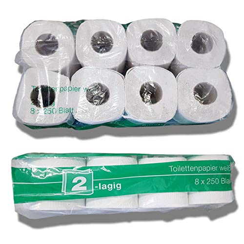 Past in gangbare dispensers: Lagen: 2-laags, 250 vellen per rol, materiaal: Recycling – natuurlijk wit, geen goedkoop donkergrijs papier – snelle verzending VE: 33 x 64 rollen (8 x 8 rollen in verpakking)
